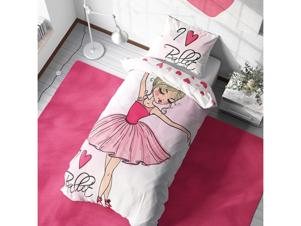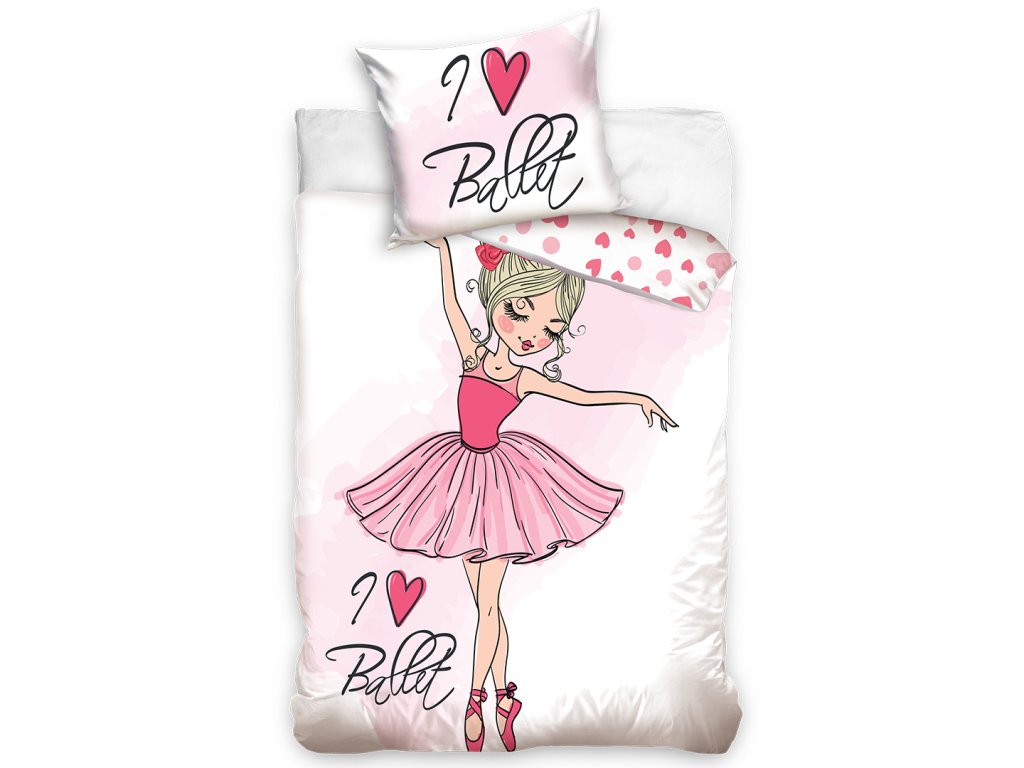 Povlečení má oboustranný potisk – každá strana má jiný motiv, díky tomu můžete snadno měnit vzhled postele podle nálady. Na přední straně je půvabná ilustrace baletky v růžové sukýnce a špičkách. Zadní strana je zdobena drobnými srdíčky a puntíky.