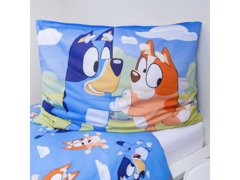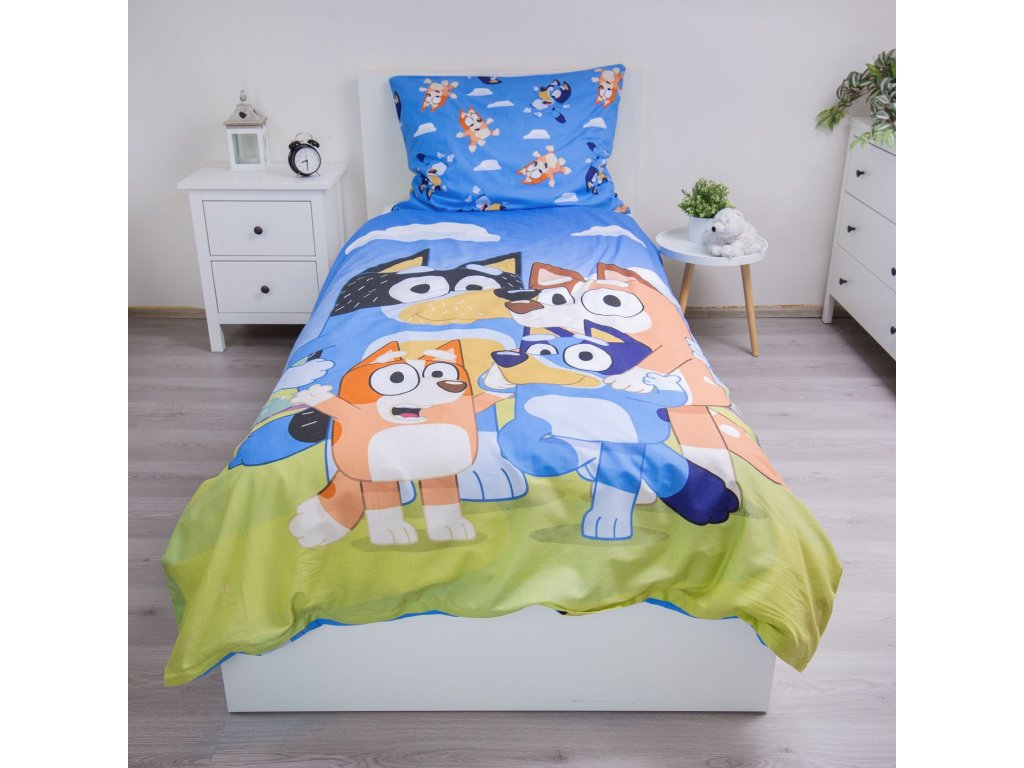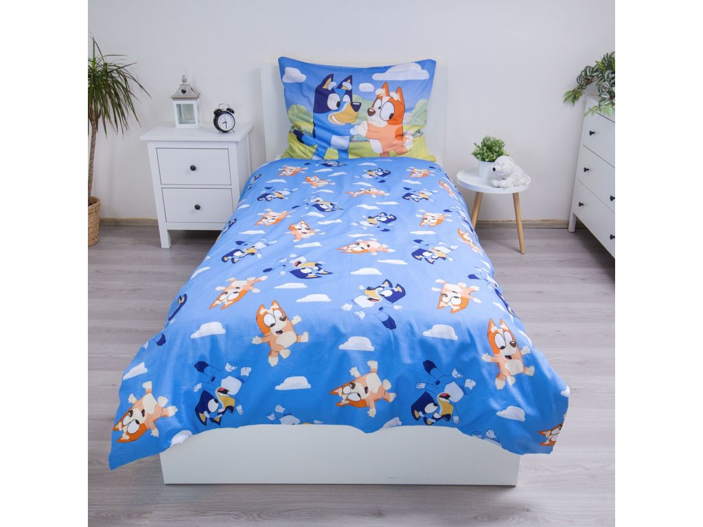 Povlečení má oboustranný potisk – každá strana má jiný motiv, díky tomu můžete snadno měnit vzhled postele podle nálady. Na přední straně povlečení je Bluey s rodinou. Zadní strana je modrá s obláčky s motivy Bluey a její sestry Bingo.