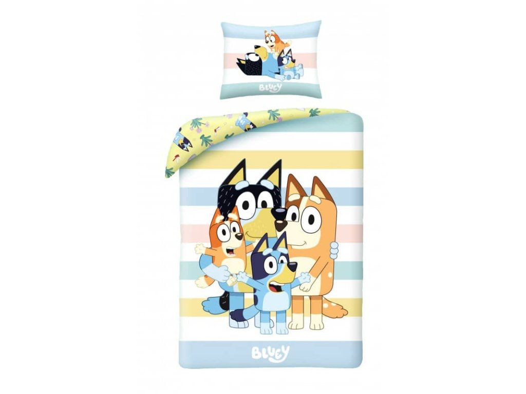 Povlečení má oboustranný potisk – každá strana má jiný motiv, díky tomu můžete snadno měnit vzhled postele podle nálady. Na přední straně povlečení je Bluey s rodinou. Zadní strana je modrá s obláčky s motivy Bluey a její sestry Bingo.
