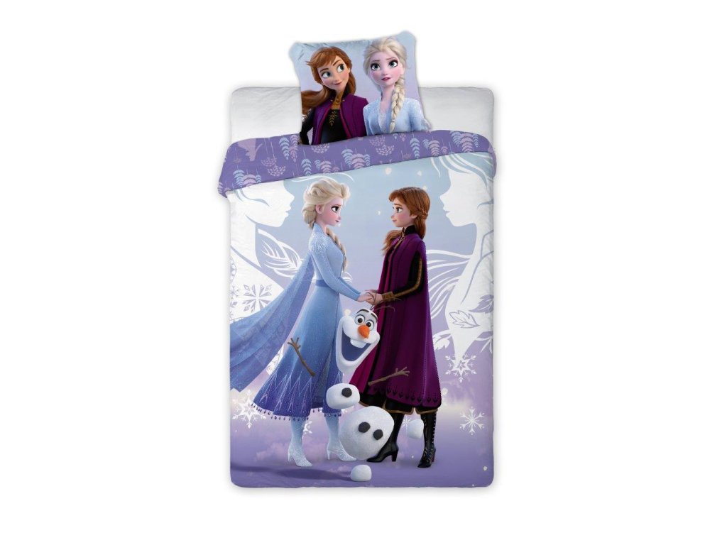 Povlečení má oboustranný potisk – každá strana má jiný motiv, díky tomu můžete snadno měnit vzhled postele podle nálady. Na přední straně povlečení je Anna, Elsa a Olaf. Zadní strana je fialová s drobnými motivy.