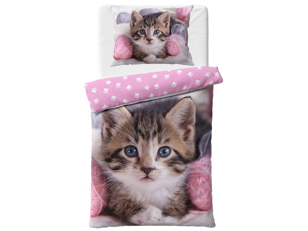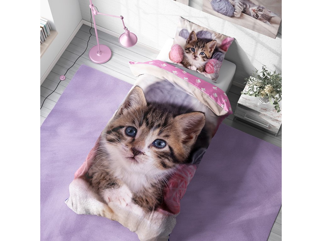 Je perfektně sladěný s přikrývkou a působí jemným a uklidňujícím dojmem, takže se stane nejen pohodlným doplňkem pro spánek, ale i krásnou dekorací postele. Povlečení má oboustranný potisk – na přední straně přikrývky je velký realistický potisk koťátka s hebkým kožíškem a okouzlujícím pohledem