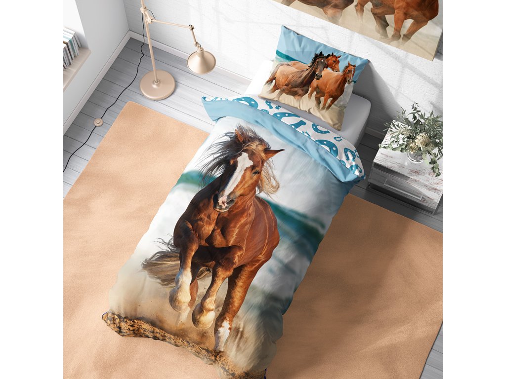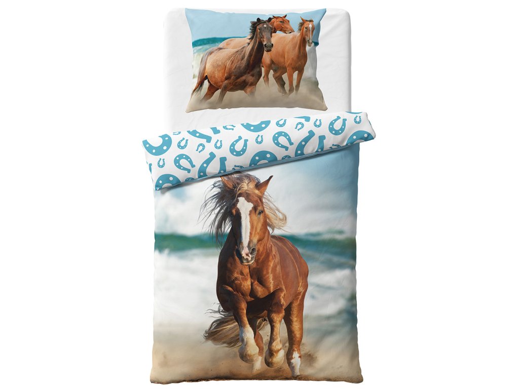 Povlečení má oboustranný potisk – na přední straně přikrývky je dominantní potisk hnědého koně cválajícího po písčité pláži s mořskými vlnami v pozadí. Zadní strana přikrývky je laděna do bílé barvy a zdobena motivem modrých podkov.