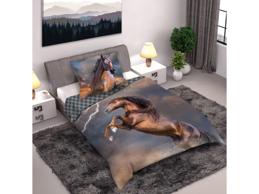 Povlečení má oboustranný potisk – každá strana má jiný motiv, díky tomu můžete snadno měnit vzhled postele podle nálady. Na přední straně povlečení je kůň v bouři. Zadní strana je kostkovaná.
