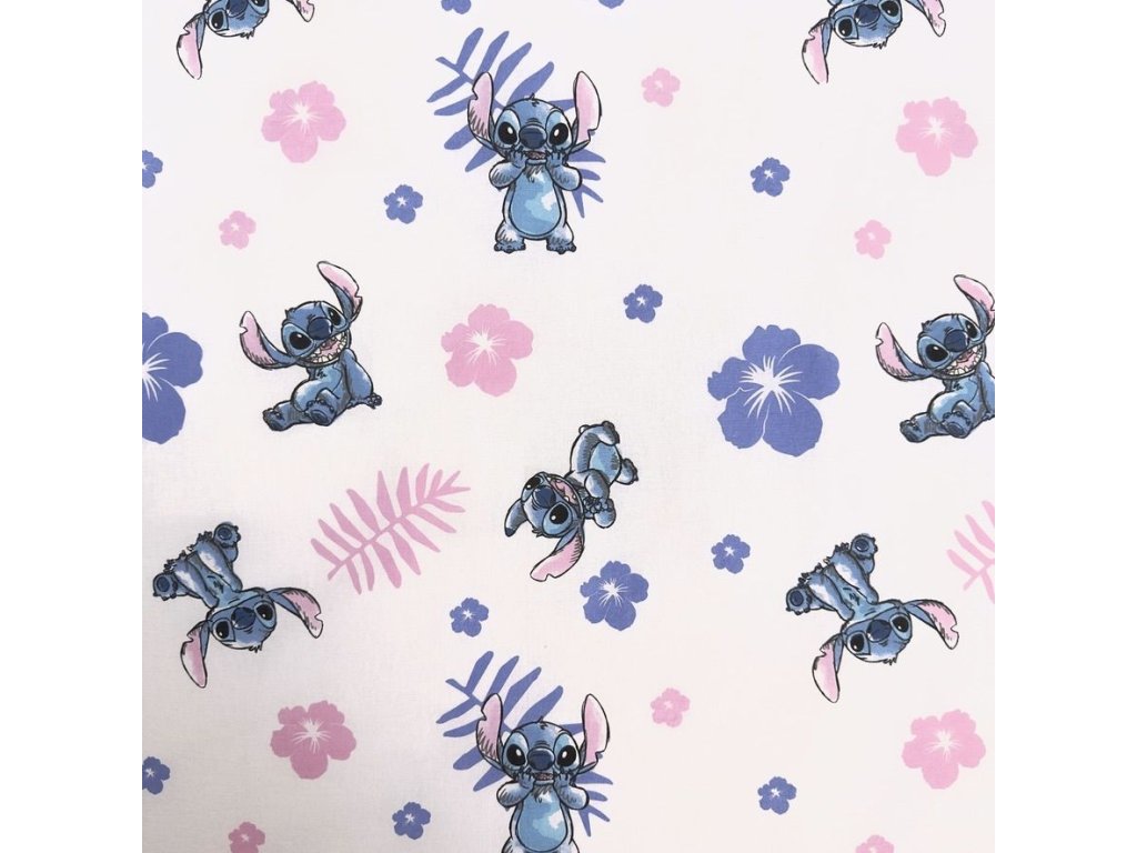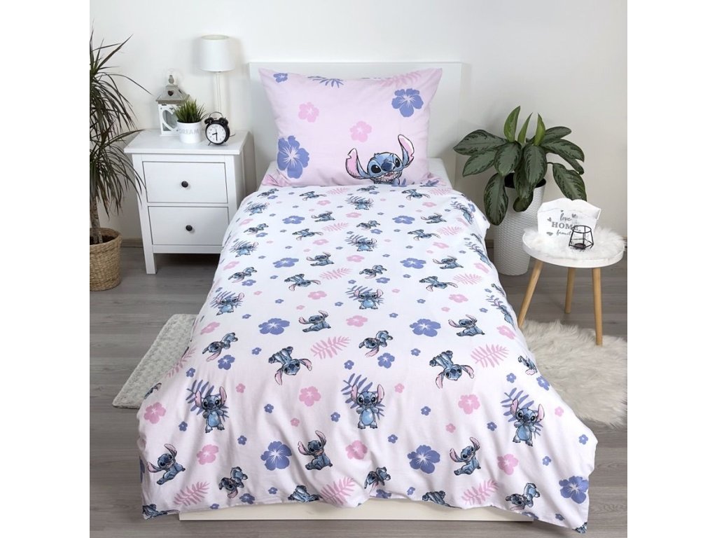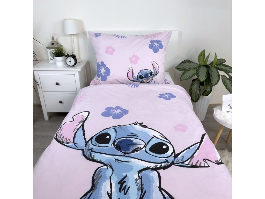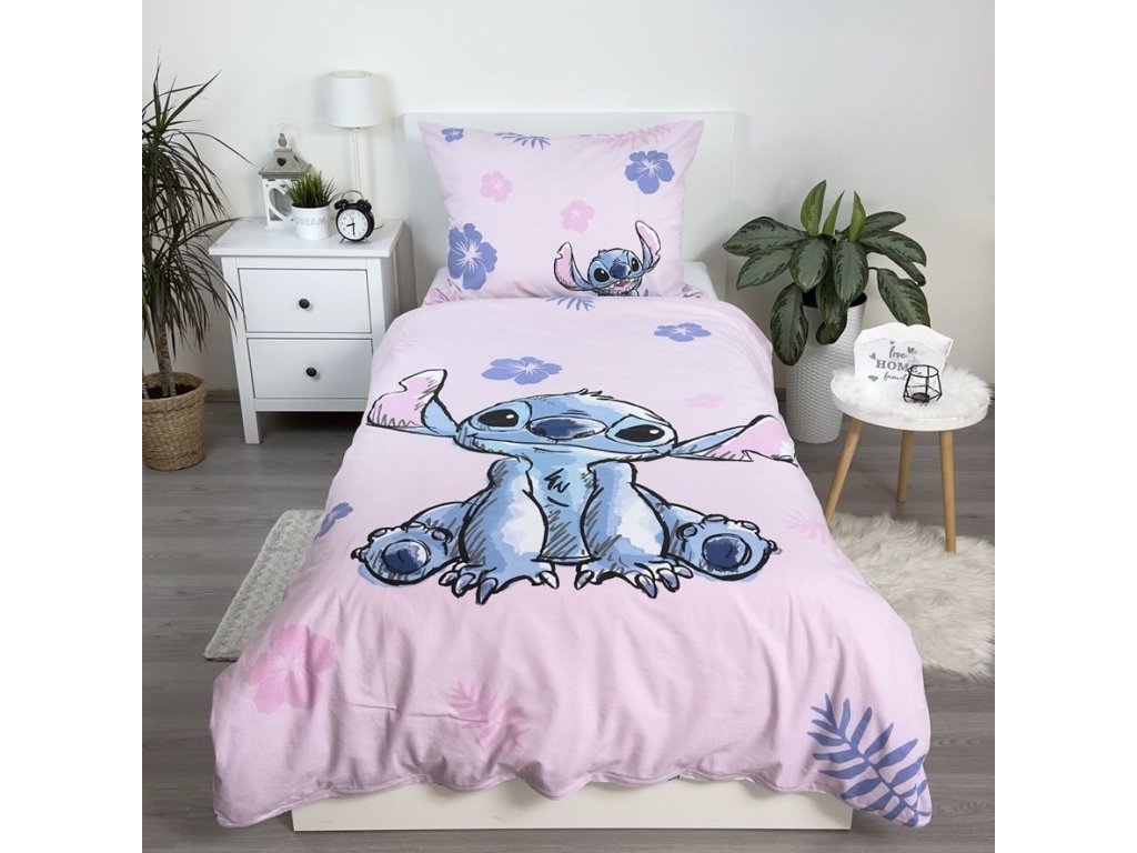 Povlečení má oboustranný potisk – každá strana má jiný motiv, díky tomu můžete snadno měnit vzhled postele podle nálady. Na přední straně povlečení je sedící Stitch. Zadní strana je růžová s drobným motivem Stitche a květů.