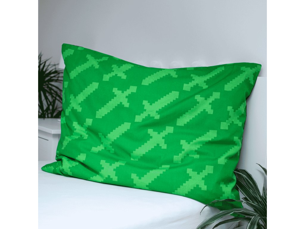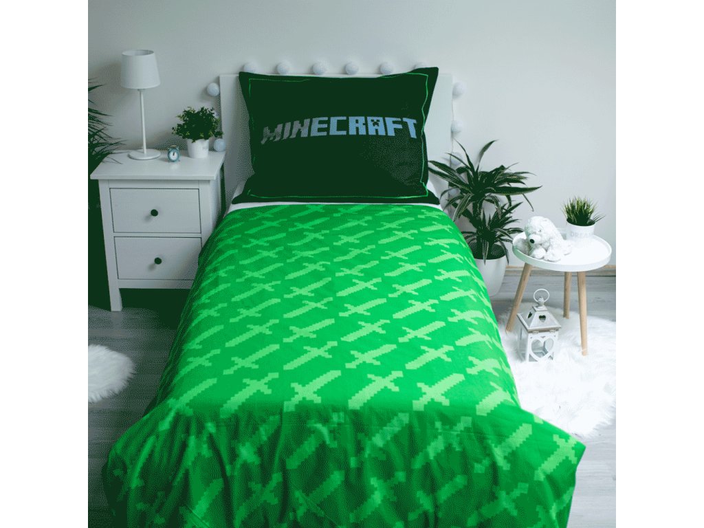 Povlečení má oboustranný potisk – každá strana má jiný motiv, díky tomu můžete snadno měnit vzhled postele podle nálady. Na přední straně povlečení je Steve, Alex, Creepers a další motivy ze světa Minecraft. Zadní strana je zelená s motivy mečů.