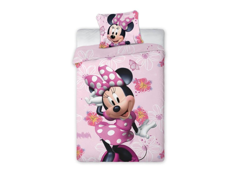 Povlečení má oboustranný potisk – každá strana má jiný motiv, díky tomu můžete snadno měnit vzhled postele podle nálady. Na přední straně povlečení je parádnice Minnie. Zadní strana je růžová s motivem kytiček.