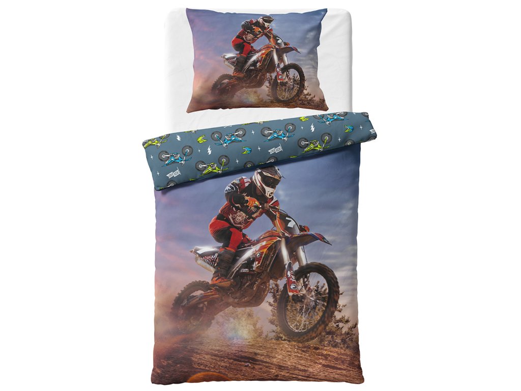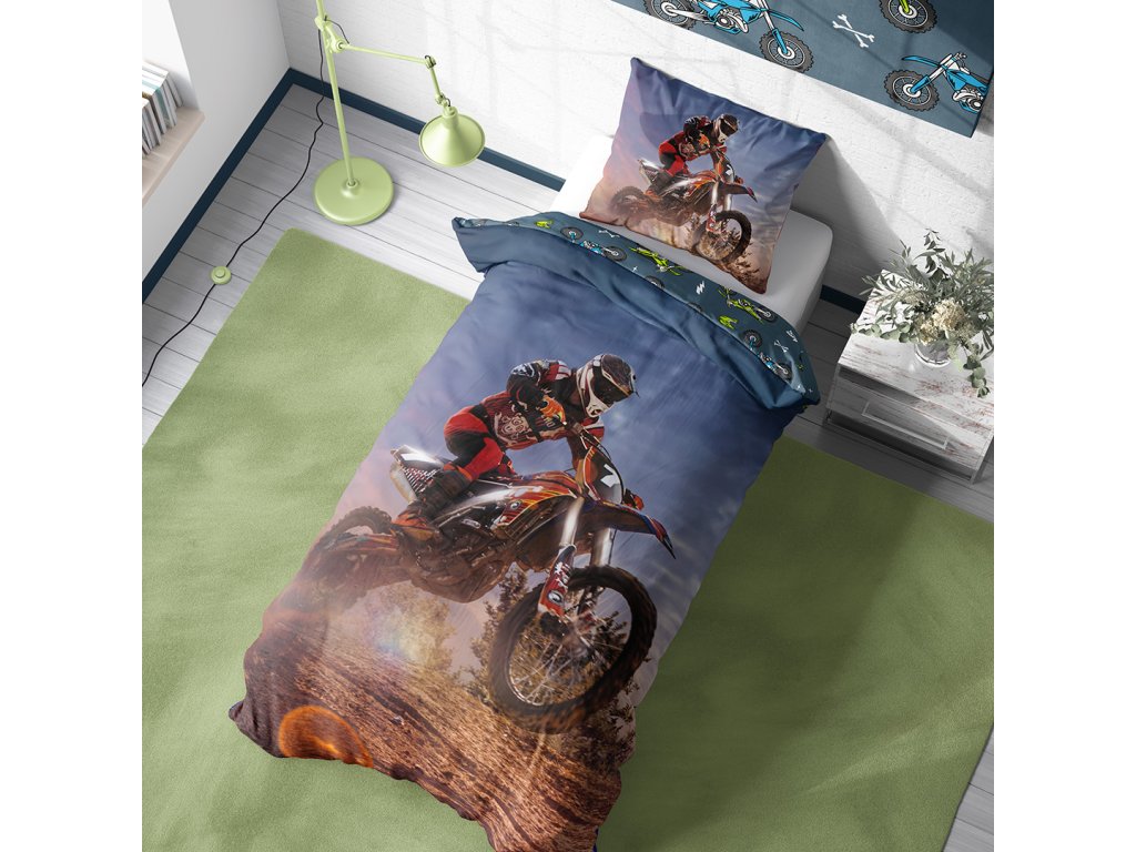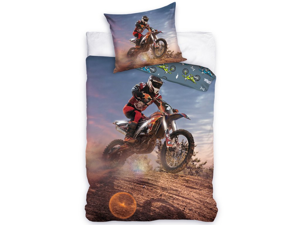 Povlečení má oboustranný potisk – na přední straně přikrývky jezdec v červeno-černé kombinéze, na zadní straně přikrývky jsou na šedém podkladu rozmístěny ilustrace motokrosových motorek v zelené a modré barvě.