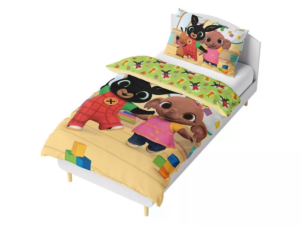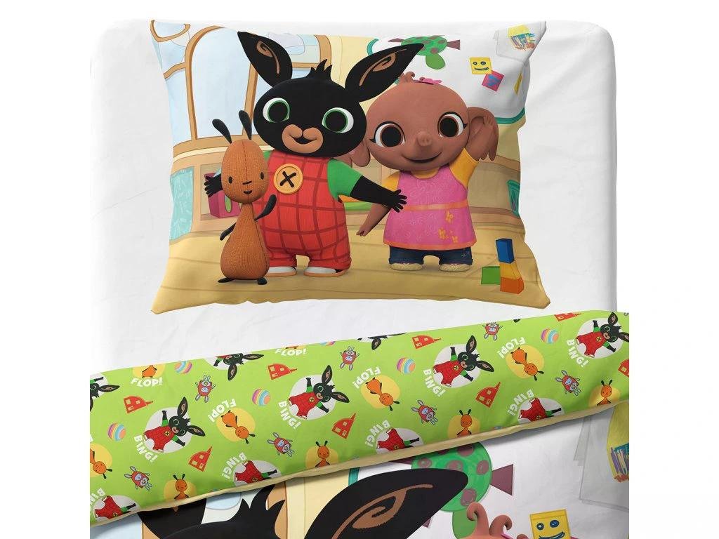 Povlečení má oboustranný potisk – každá strana má jiný motiv, díky tomu můžete snadno měnit vzhled postele podle nálady. Na přední straně povlečení je Bing a Sula ve školce. Zadní strana je se světle zelená s drobnými motivy.