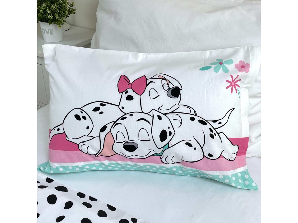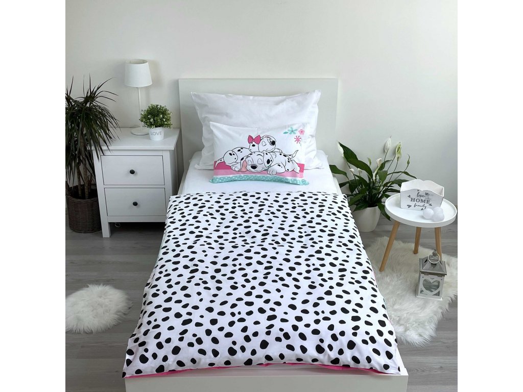 Povlečení má oboustranný potisk – každá strana má jiný motiv, díky tomu můžete snadno měnit vzhled postele podle nálady. Na přední straně je výrazný motiv dvou štěňat dalmatinů. Zadní stranu pokrývá vzor typických dalmatinských flíčků.