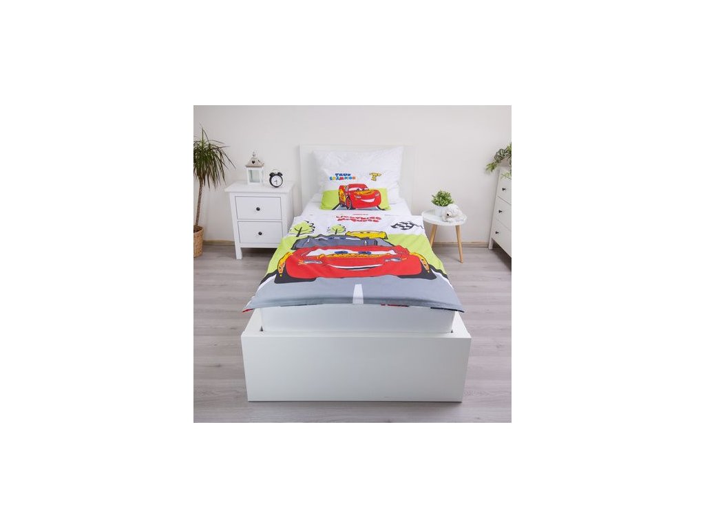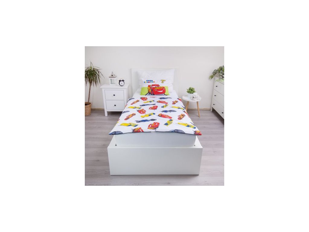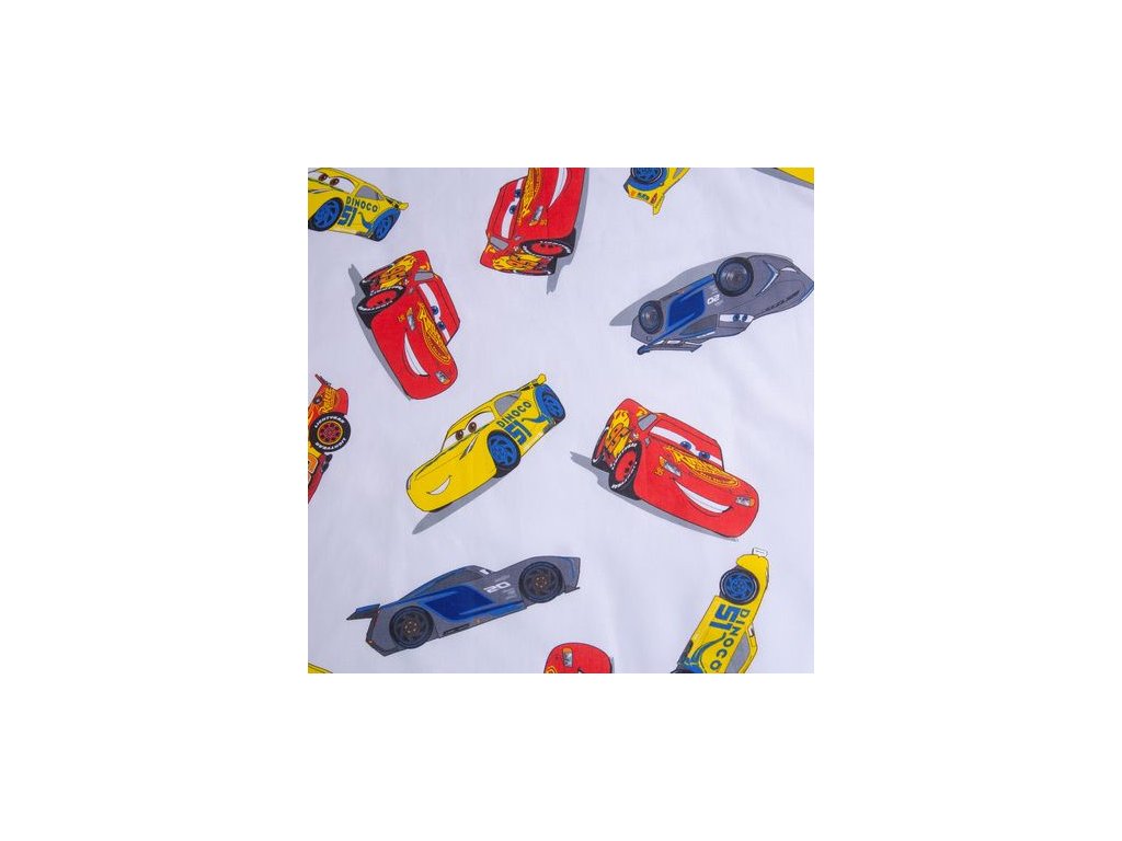Povlečení má oboustranný potisk – každá strana má jiný motiv, díky tomu můžete snadno měnit vzhled postele podle nálady. Na přední straně povlečení je Blesk McQueen, Jackson, Cruz, kteří závodí. Zadní strana je bílá s drobnými motivy aut.