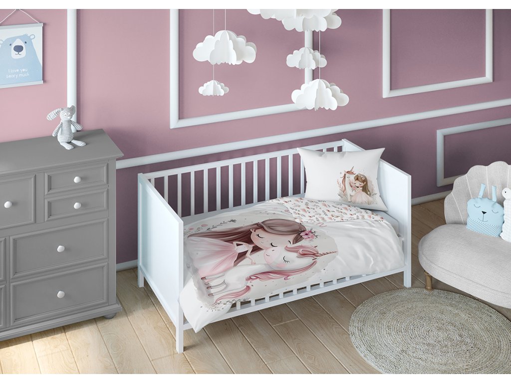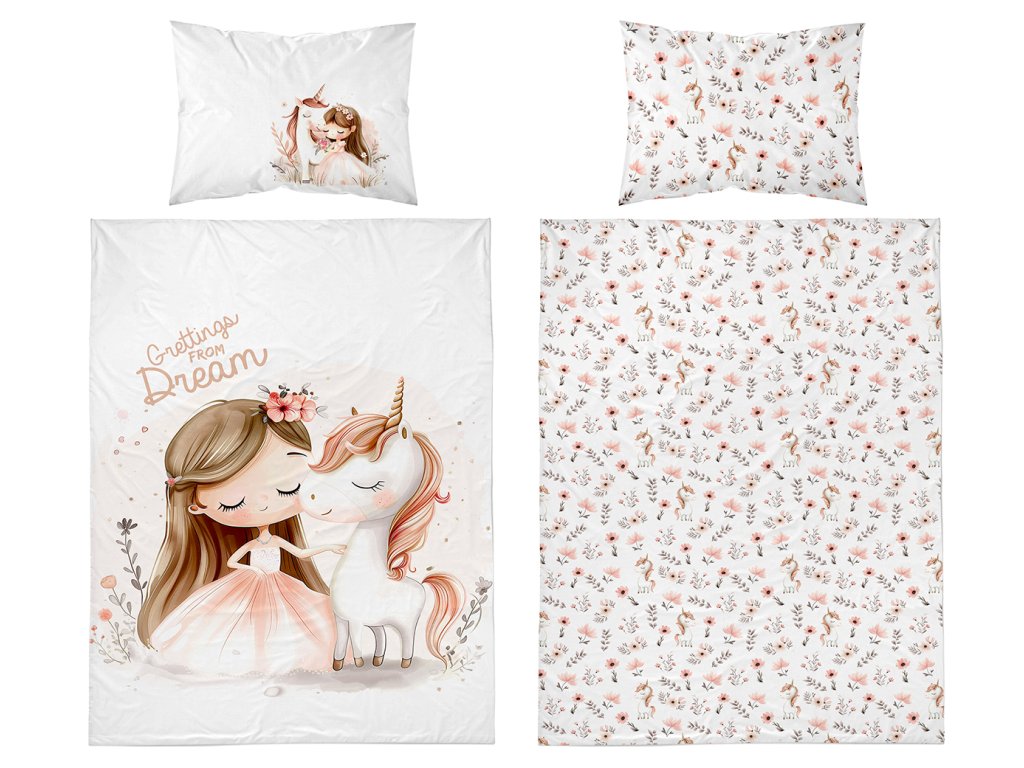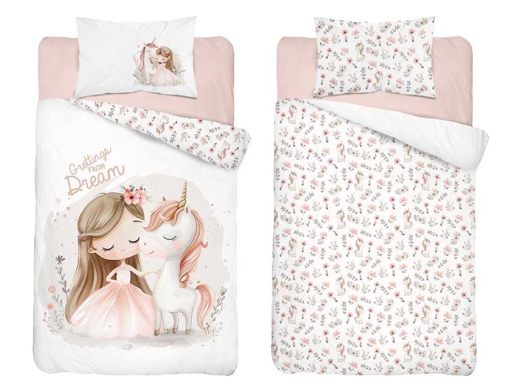 Povlečení má oboustranný potisk – každá strana má jiný motiv, díky tomu můžete snadno měnit vzhled postele podle nálady. Na přední straně povlečení je něžná ilustrace holčičky v růžových šatech objímající bílého jednorožce. Zadní strana je zdobena drobným opakujícím se vzorem jednorožců, květin a lístků v jemných růžových a šedých tónech.