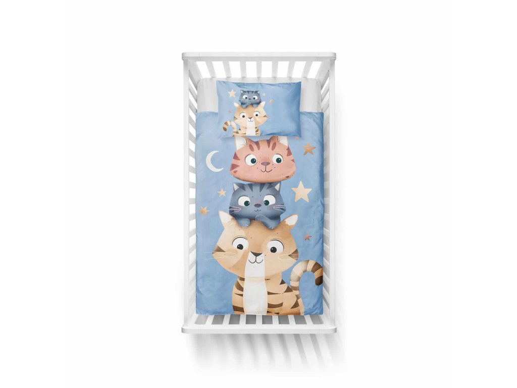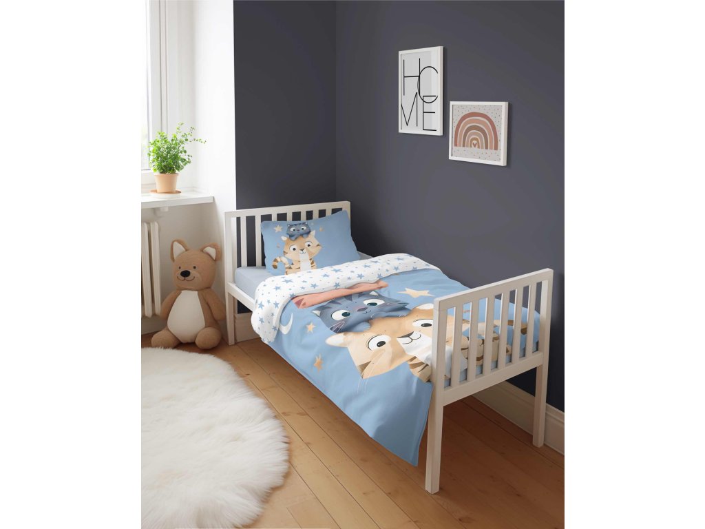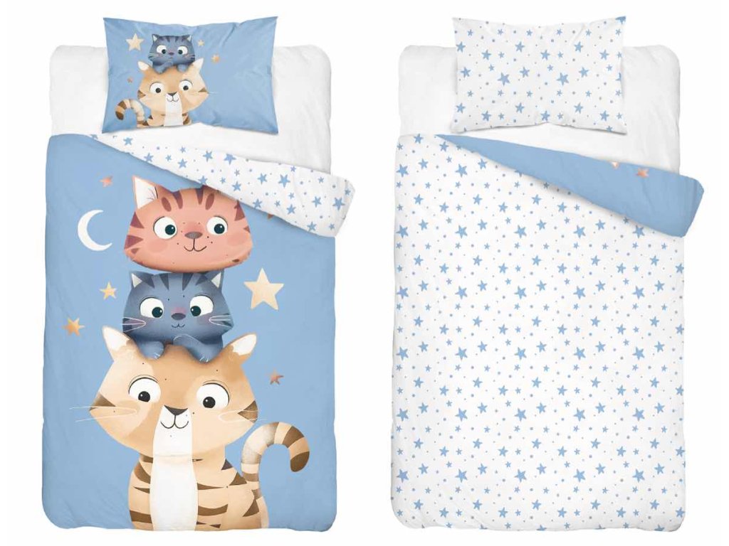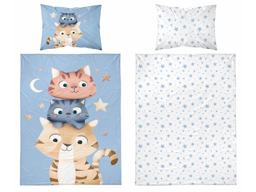 Povlečení má oboustranný potisk – každá strana má jiný motiv, díky tomu můžete snadno měnit vzhled postele podle nálady. Na přední straně povlečení vyniká velký motiv tří roztomilých kočiček doplněný jemnými hvězdičkami. Zadní strana je celoplošně zdobena drobnými hvězdičkami, které vytvářejí něžný a klidný vzhled.