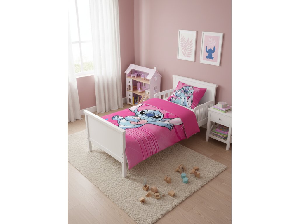 Povlečení má oboustranný potisk – každá strana má jiný motiv, díky tomu můžete snadno měnit vzhled postele podle nálady. Na přední straně povlečení je Stitch držící srdíčko. Zadní strana je růžová.