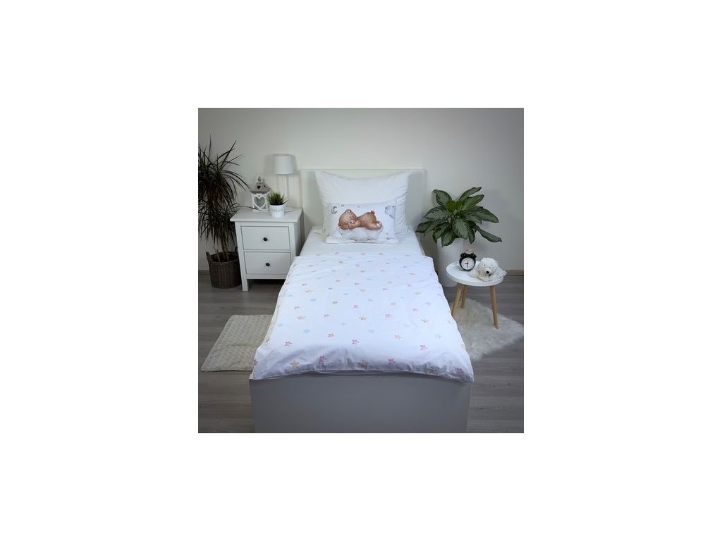 Bavlněné povlečení do postýlky s roztomilým Medvídkem má na každé straně jiný potisk. Bavlna je prodyšná a savá, je tak vhodná pro celoroční používání. Zapínání na zip je pohodlné a ulehčí práci při převlékání.