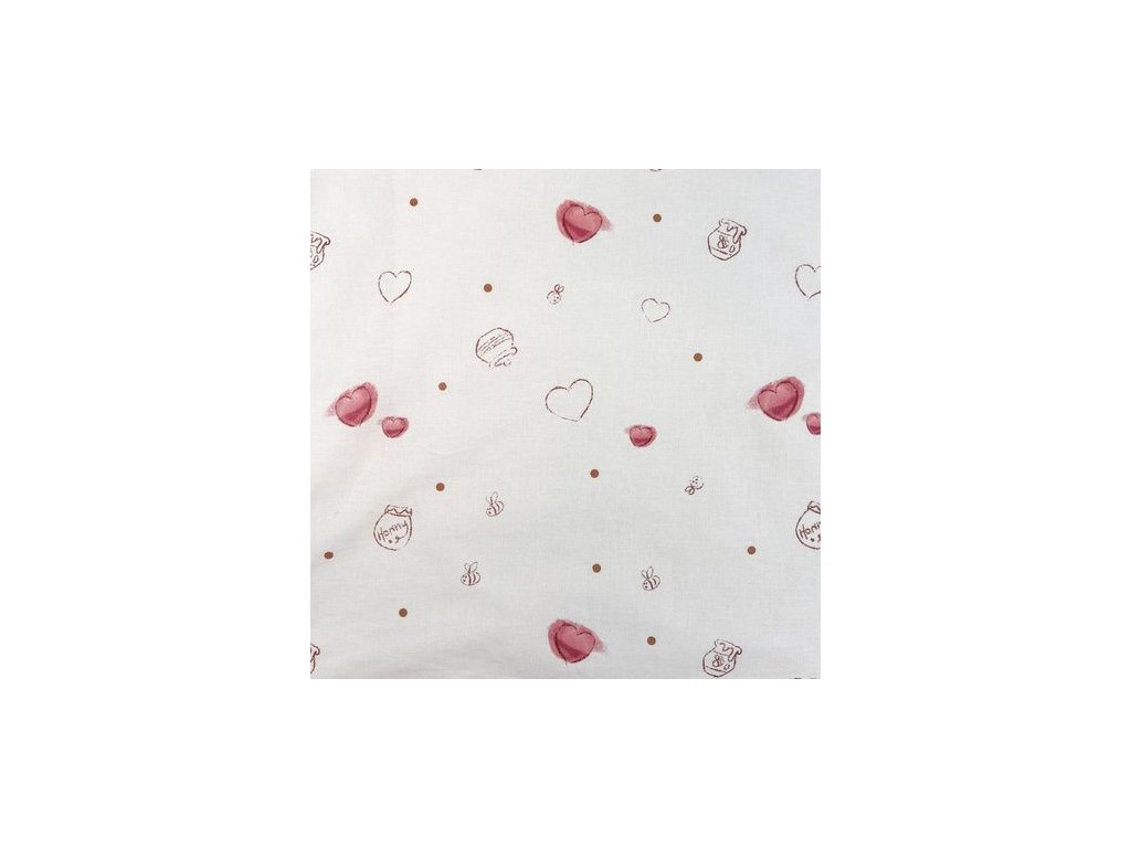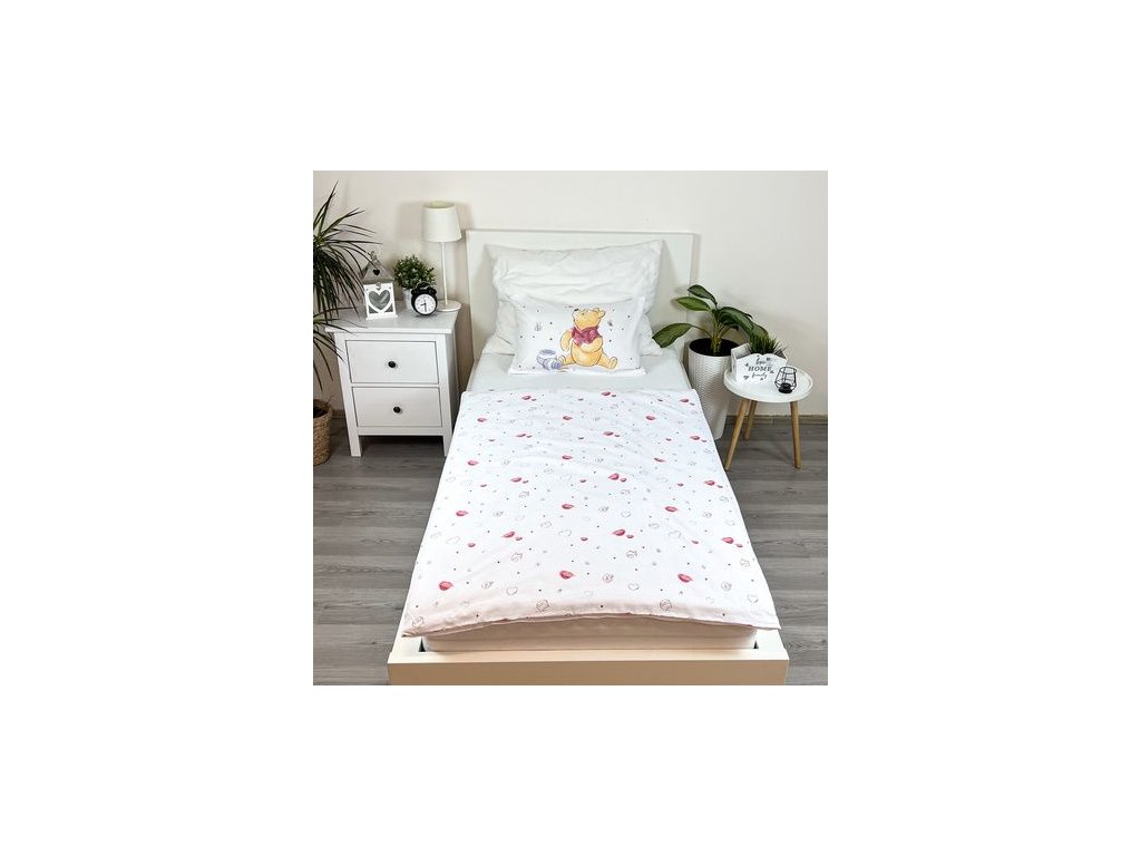 Povlečení má oboustranný potisk – každá strana má jiný motiv, díky tomu můžete snadno měnit vzhled postele podle nálady. Na přední straně povlečení je medvídek Pú s jeho přáteli jak slaví narozeniny. Zadní strana je bílá s motivem malých srdíček a medu.