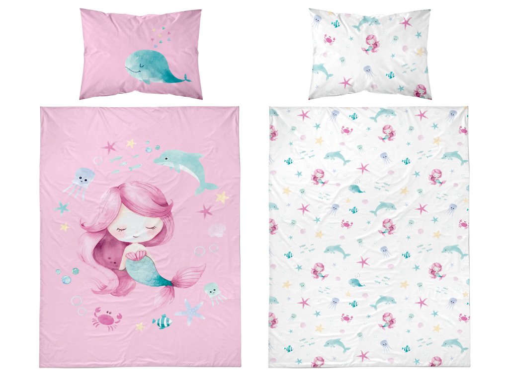 Povlečení má oboustranný potisk – každá strana má jiný motiv, díky tomu můžete snadno měnit vzhled postele podle nálady. Na přední straně povlečení je malá mořská víla a s ní delfín, chobotnice a rybičky. Zadní strana je bílá s drobnými motivy malé víly a jejich mořských kamarádů.