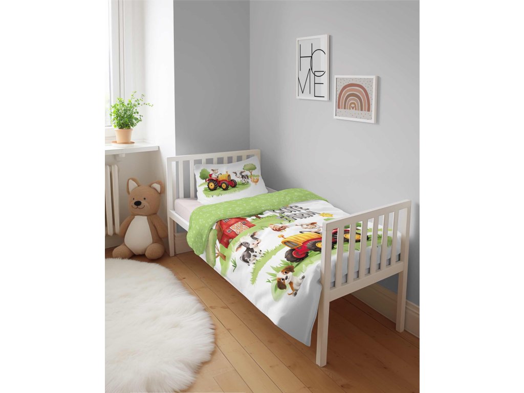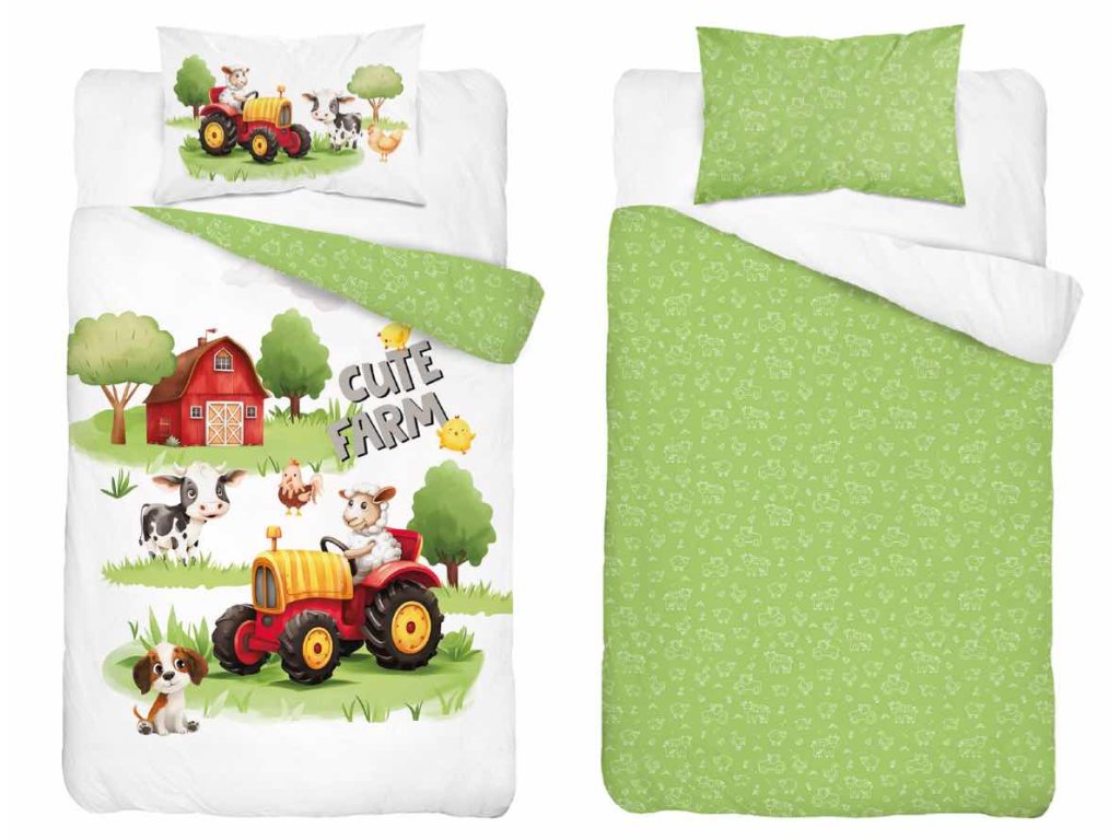 Povlečení má oboustranný potisk – každá strana má jiný motiv, díky tomu můžete snadno měnit vzhled postele podle nálady. Na přední straně povlečení se na zvířecí farmě směle prohání ovečka, která řídí traktor, spolu s pejskem, prasátkem, slepičkou a kuřátky. Zadní strana je celá zelenkavá s bílými obrysy všech farmářských zvířátek.