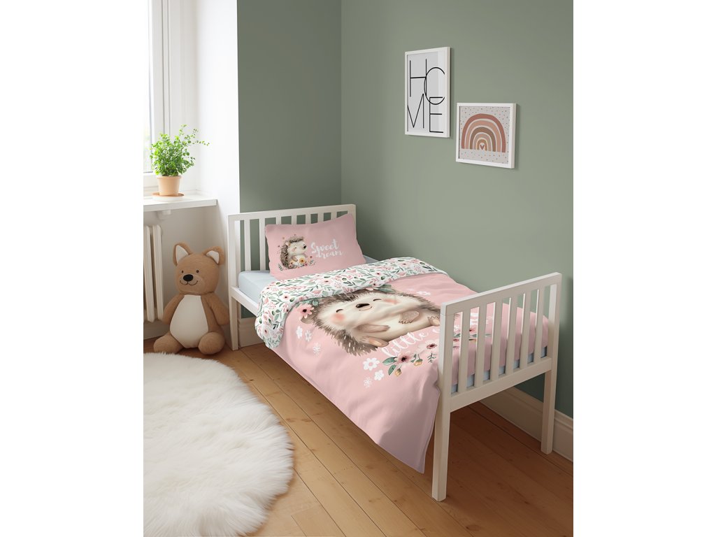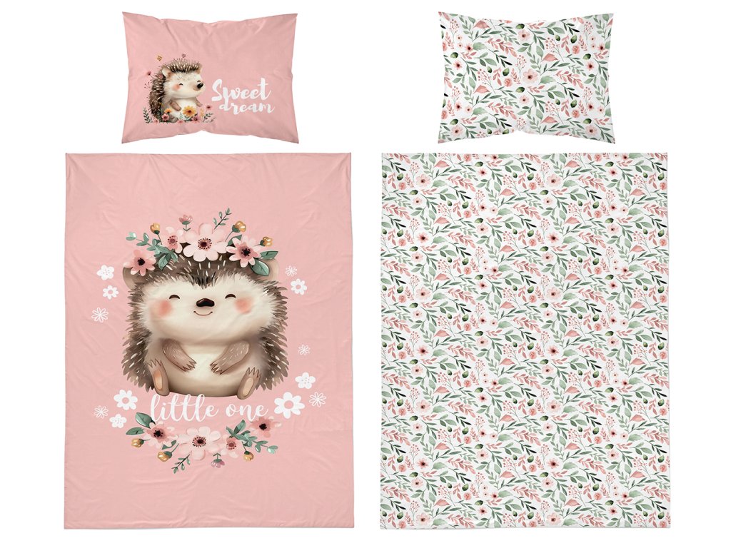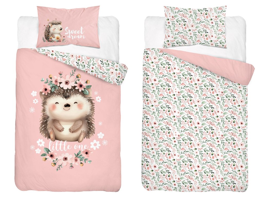 Povlečení má oboustranný potisk – každá strana má jiný motiv, díky tomu můžete snadno měnit vzhled postele podle nálady. Na přední straně povlečení dominuje velký motiv roztomilého ježečka obklopeného něžnými kytičkami. Zadní strana je celoplošně zdobena drobnými kvítky, které působí jemně a harmonicky.