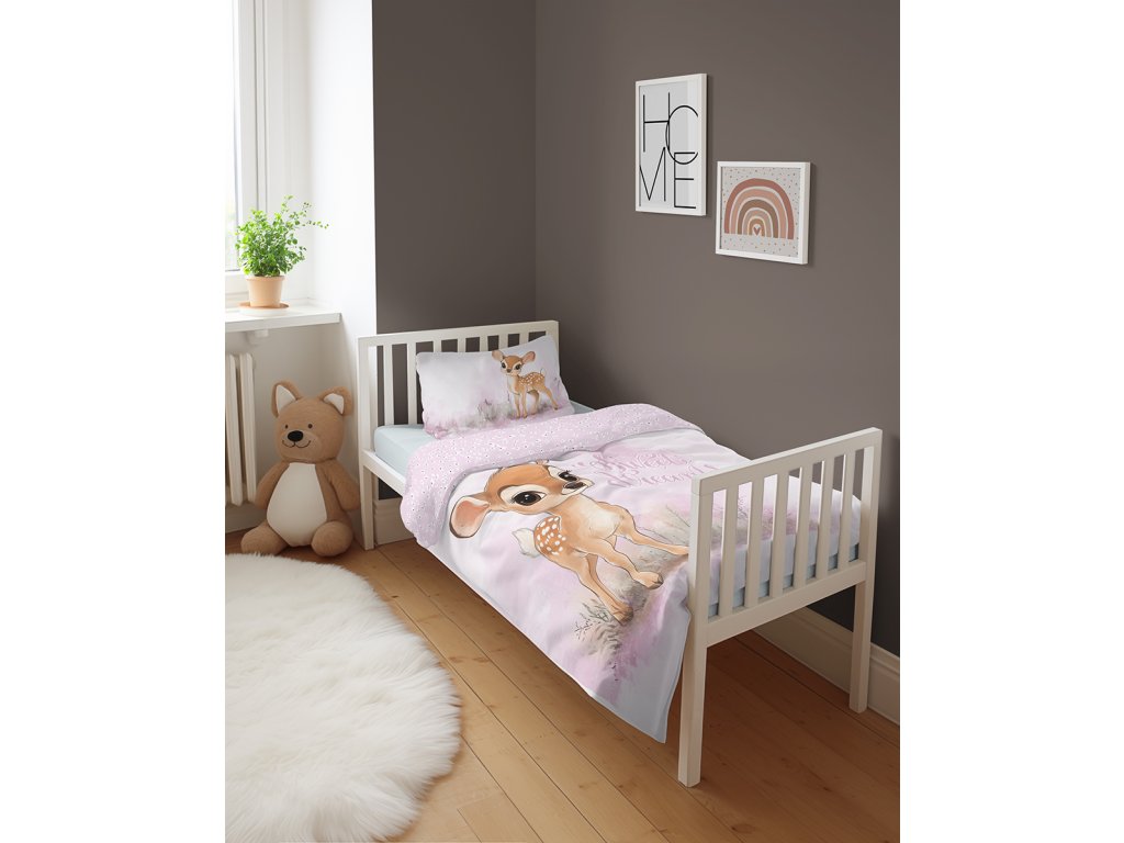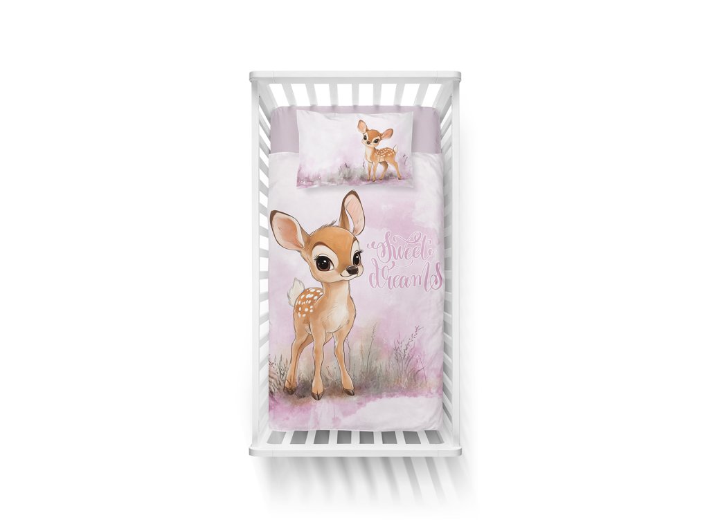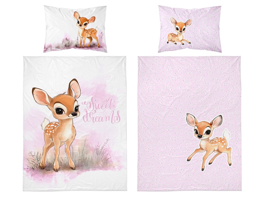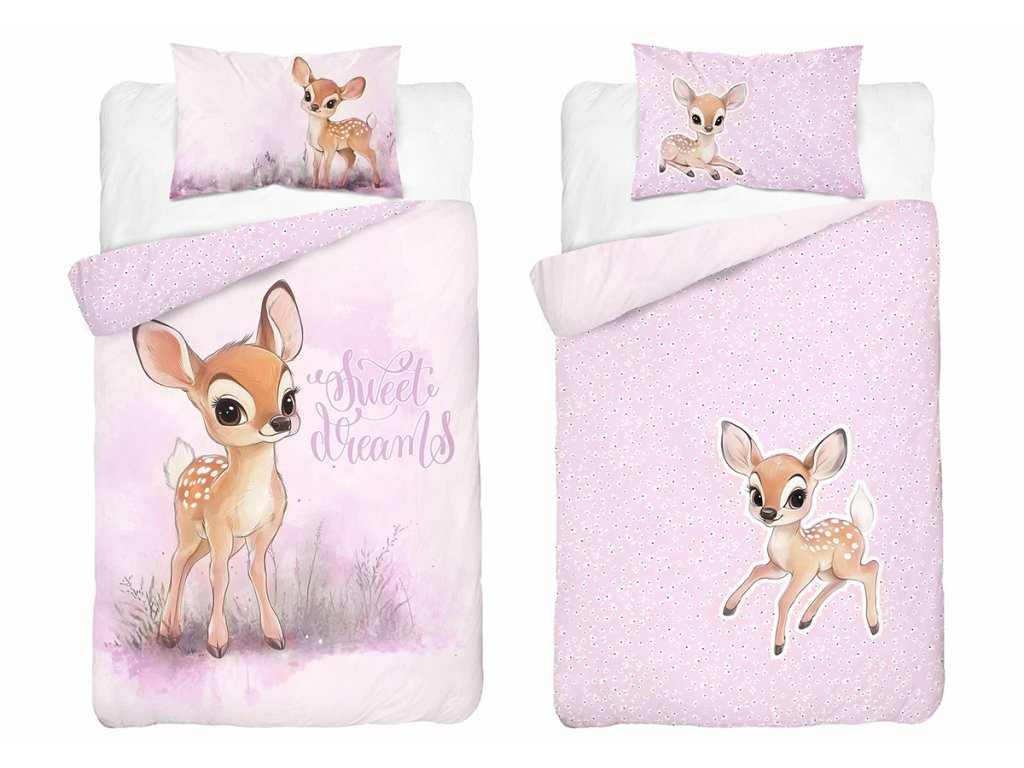 Povlečení má oboustranný potisk – každá strana má jiný motiv, díky tomu můžete snadno měnit vzhled postele podle nálady. Na přední straně povlečení je roztomilá ilustrace malého srnečka na jemně růžovém podkladu. Zadní strana je světle růžová s drobným květinovým vzorem a motivem malého srnečka.