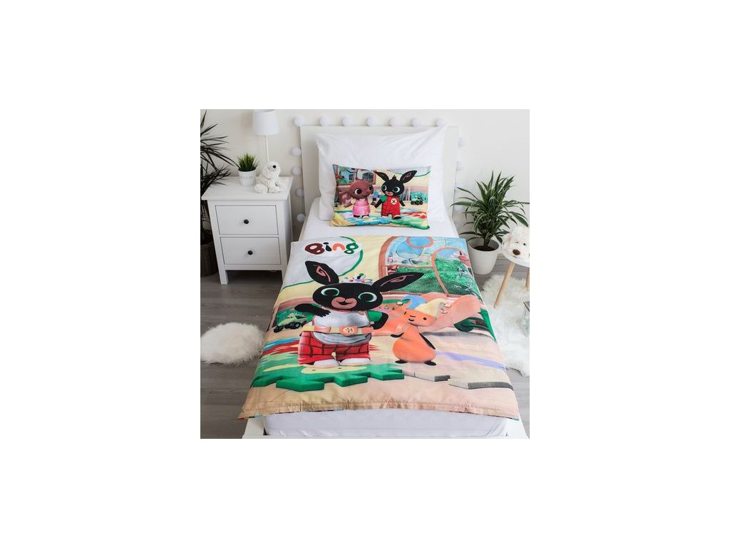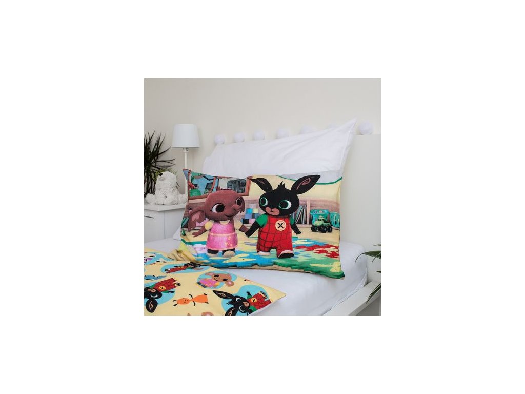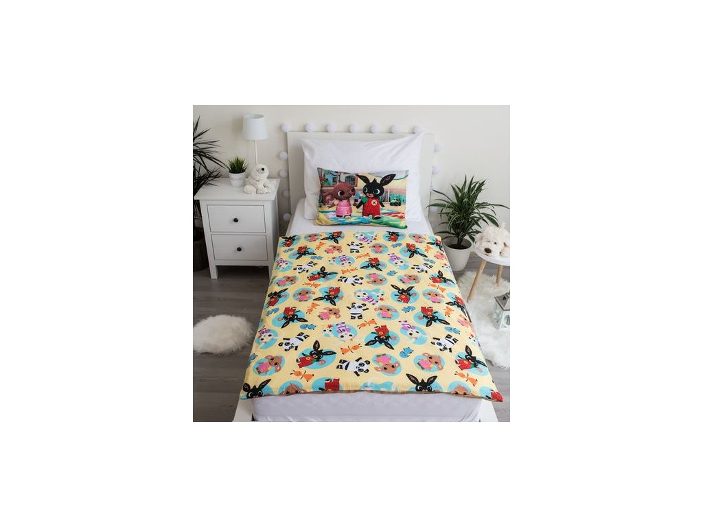 Povlečení má oboustranný potisk – každá strana má jiný motiv, díky tomu můžete snadno měnit vzhled postele podle nálady. Na přední straně povlečení je Bing a jeho kamarád. Zadní strana je žlutá s postavičkami ze světa Binga.