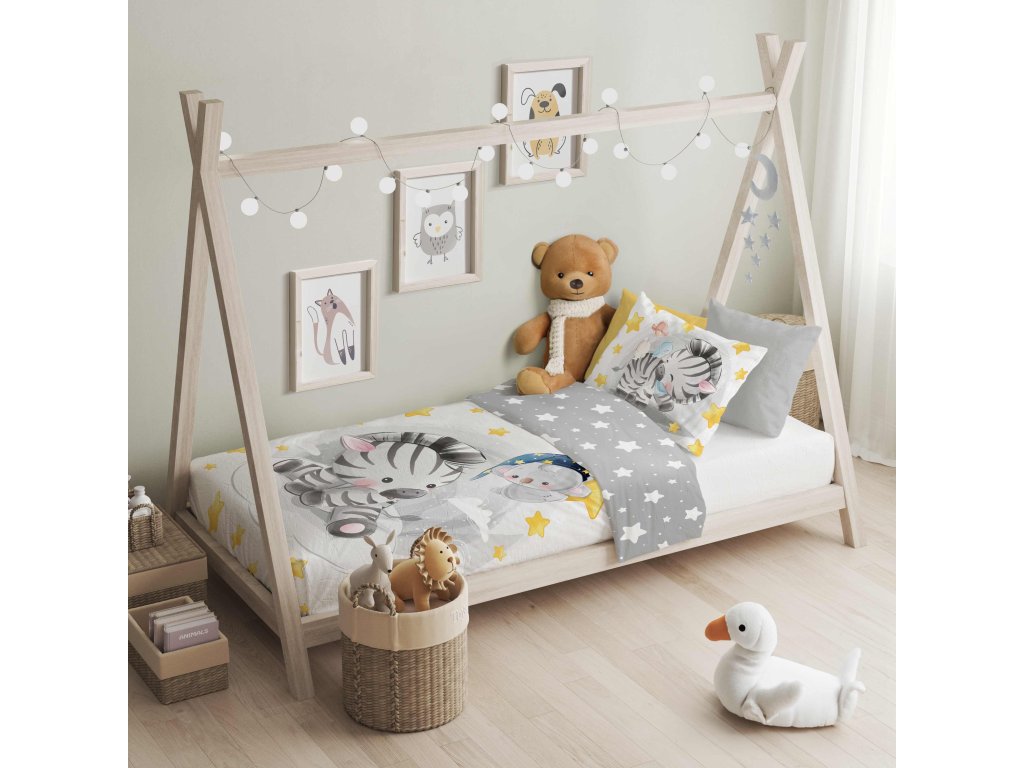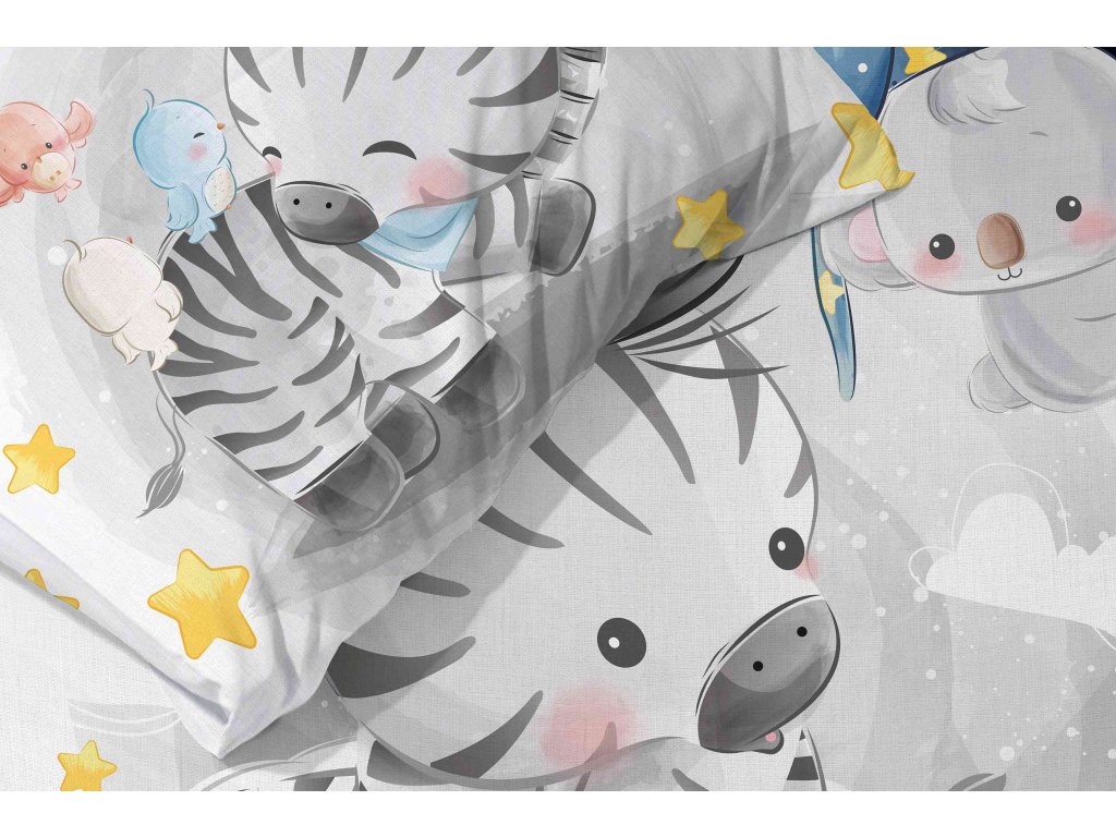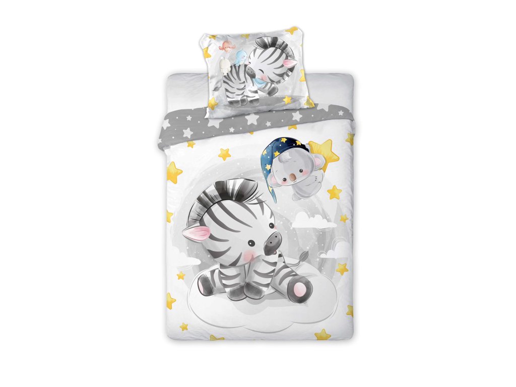 Povlečení má oboustranný potisk – každá strana má jiný motiv, díky tomu můžete snadno měnit vzhled postele podle nálady. Na přední straně povlečení je zebra s roztomilým medvídkem. Zadní strana je šedivá s hvězdičky.