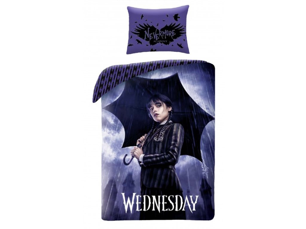 Povlečení má oboustranný potisk – každá strana má jiný motiv, díky tomu můžete snadno měnit vzhled postele podle nálady. Na přední straně povlečení je atraktivní motiv Wednesday. Zadní strana je fialová s motivem černých havranů.
