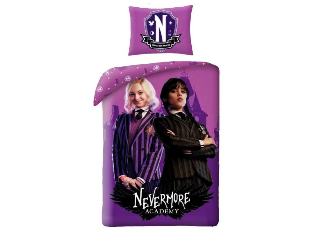 Povlečení má oboustranný potisk – každá strana má jiný motiv, díky tomu můžete snadno měnit vzhled postele podle nálady. Na přední straně povlečení je atraktivní motiv Wednesday. Zadní strana je fialová s logem akademie.