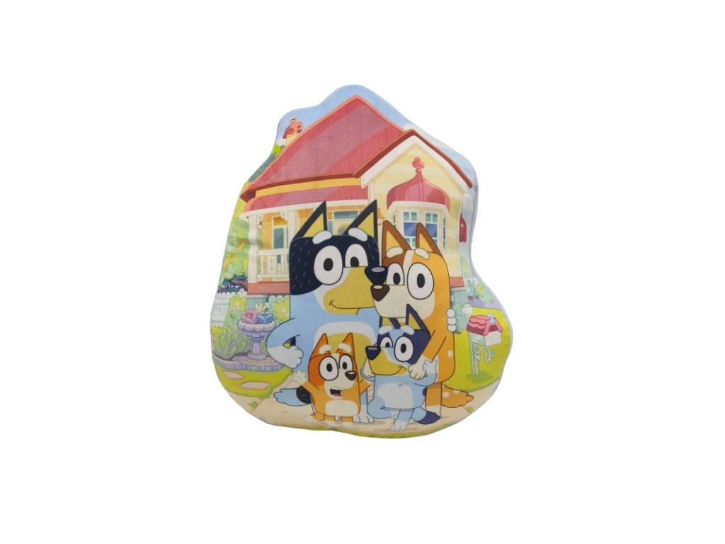 Dětský dekorační polštářek s motivem Bluey je krásným a praktickým doplňkem každé dětské postýlky. Na povlaku je Bluey s jeho rodinou.