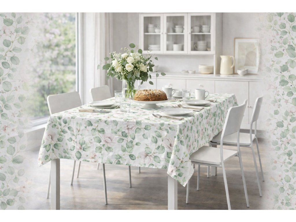 Stylový ubrus s jemným akvarelovým motivem zelených listů, které svým tvarem připomínají eukalyptus, je doplněn o něžné světle růžové květy, které dodávají celé kompozici lehkost a romantický nádech. Vzor působí vzdušně a přirozeně, takže ubrus vnese do prostoru pocit klidu a harmonie. Díky své jemnosti a elegantní kombinaci barev se skvěle hodí do světlých interiérů, kde doplní stylové aranžmá jídelního stolu. Je ideální volbou pro všechny, kdo milují přírodní motivy, skandinávský minimalismus nebo jemný vintage styl, a dokáže dodat interiéru jemný, ale zároveň sofistikovaný nádech.