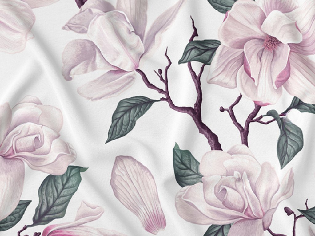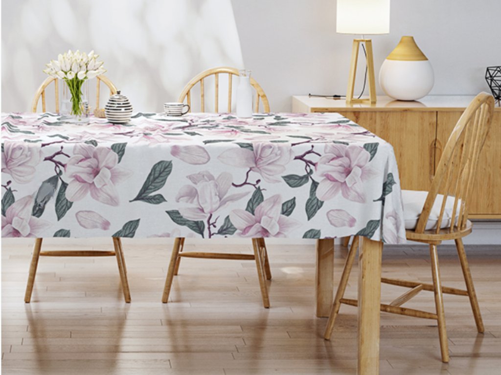 Tento ubrus přináší do vašeho domova jemnou eleganci a romantický nádech díky něžným květům magnólií. Bílý podklad vyniká čistotou a svěžestí, zatímco světle růžové květy a lístky dodávají sofistikovaný a nadčasový vzhled každému stolování.