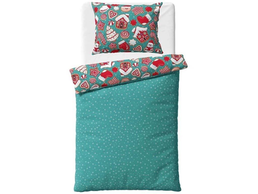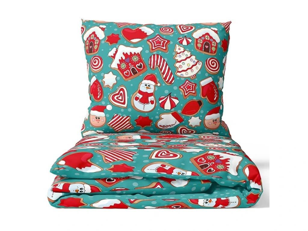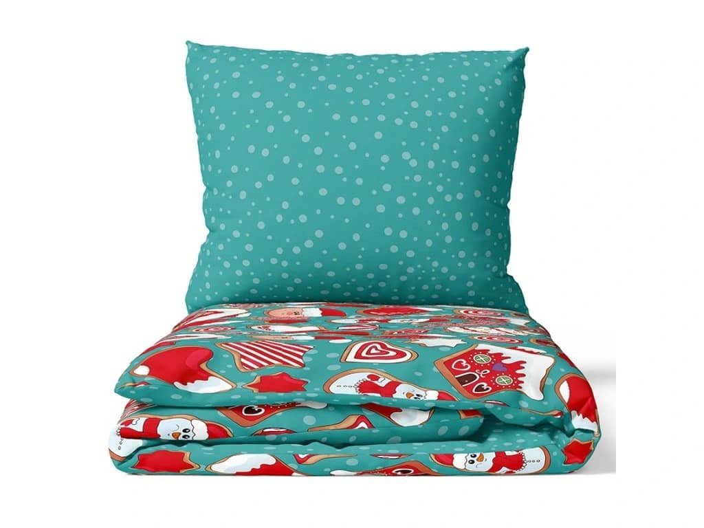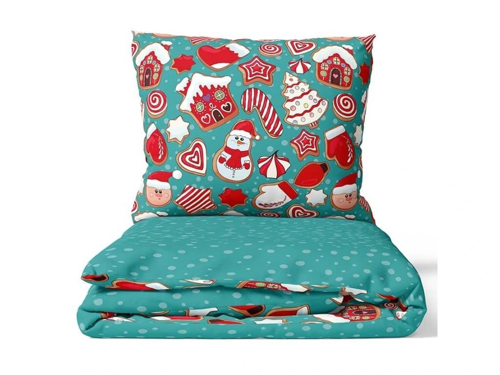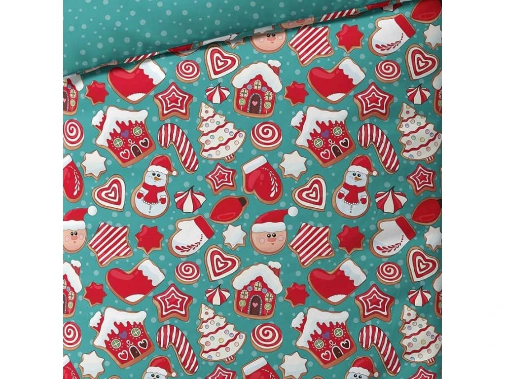 Na přední straně povlaku přikrývky se rozprostírá krásný motiv s vánočními perníčky, které dodávají celému designu tu pravou sváteční atmosféru. Těšit se můžete na roztomilého Santu s čepičkou, sněhuláka, vánoční domečky, rukavičky, hvězdičky, srdíčka a další vánoční motivy, které jsou rozmístěny po celé lícní straně.