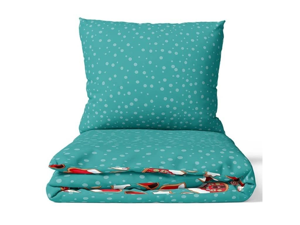 Rubová strana povlečení je jemně poseta vzorem bílých teček, připomínajících padající sníh, který dodává povlečení ještě více kouzelný nádech. Povlak polštáře je oboustranný a ladí stejně jako lícní a rubová strana přikrývky.