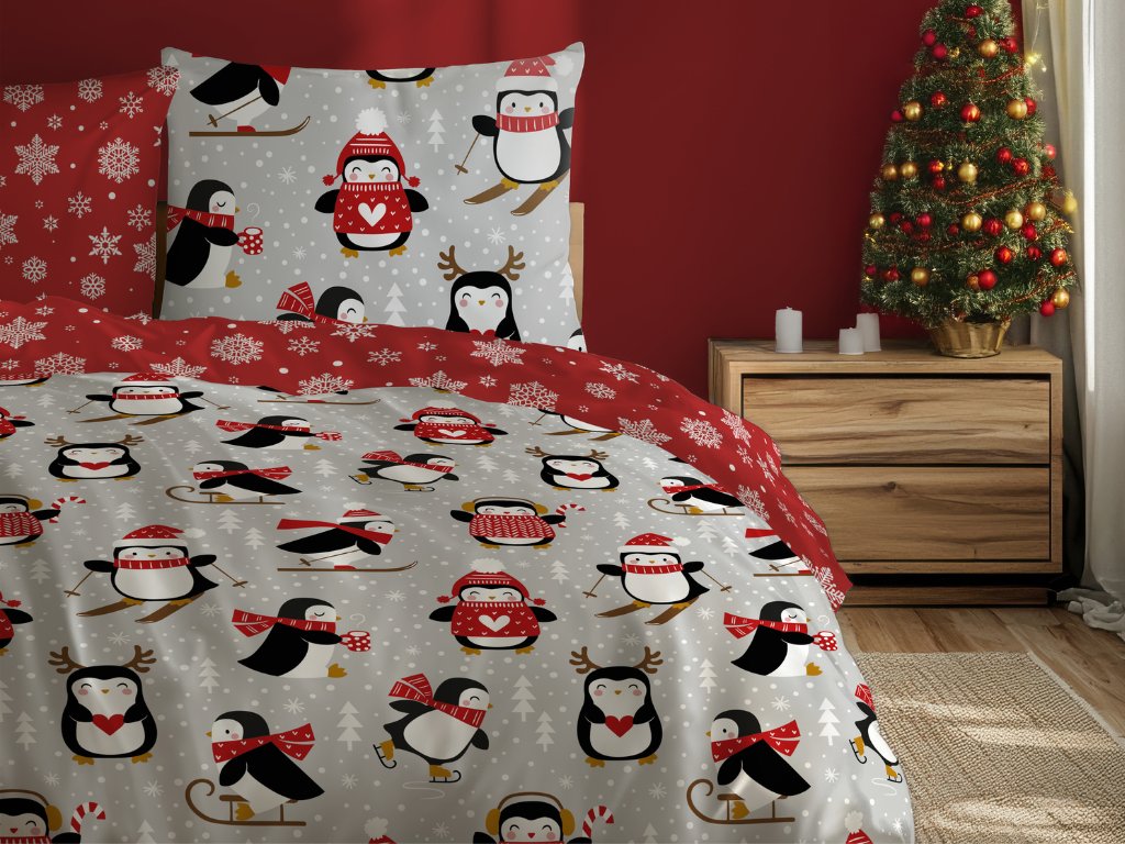 Povlečení má oboustranný potisk – každá strana má jiný motiv, díky tomu můžete snadno měnit vzhled postele podle nálady. Přední strana povlečení je šedá s motivem tučňáků. Zadní strana povlečení je červená s motivem vloček.